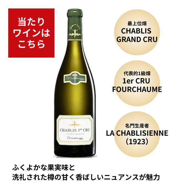 必ず総額17,000円以上のワイン入り!1本8,500円のシャブリグランクリュ、“ラシャブリジェンヌ プルミエクリュ フルショーム”が入ったセットが当たる赤白6本福袋。